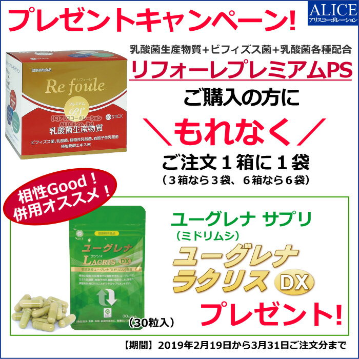 リフォーレプレミアムPS 販売一覧 【関連品】 ユーグレナ(みどりむし)は乳酸菌と相性が良いことが確認されています。