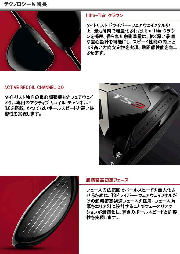 タイトリスト独自の調整機能SURE FIT CGウェイトを搭載し、打点と重心を近づけてボールスピードを最大化させると同時に最高の打感を実現するTS3フェアウェイメタル。