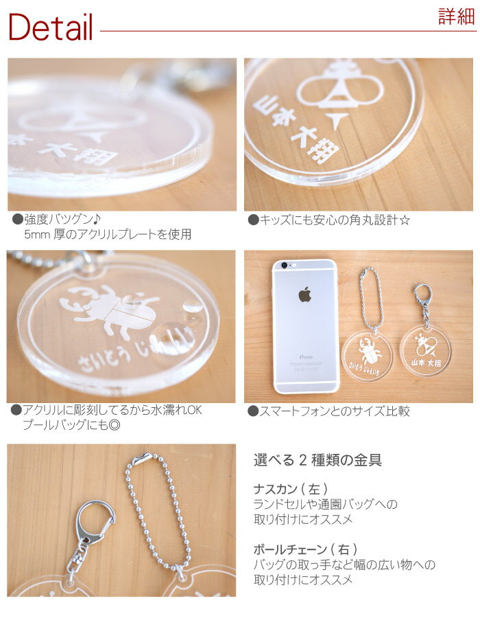 仕様 / サイズ ■サイズ:厚み 約5mm / 直径 約5.3cm ■材質:アクリル ■金具:ボールチェーン(約15cm) / ナスカンキー 配送方法 宅配便/メール便 彫刻内容 ●文字数 かな文字:1行10文字まで ローマ字:1行14文字まで ※書体は、元気イッパイの角ポップ体で彫刻します。